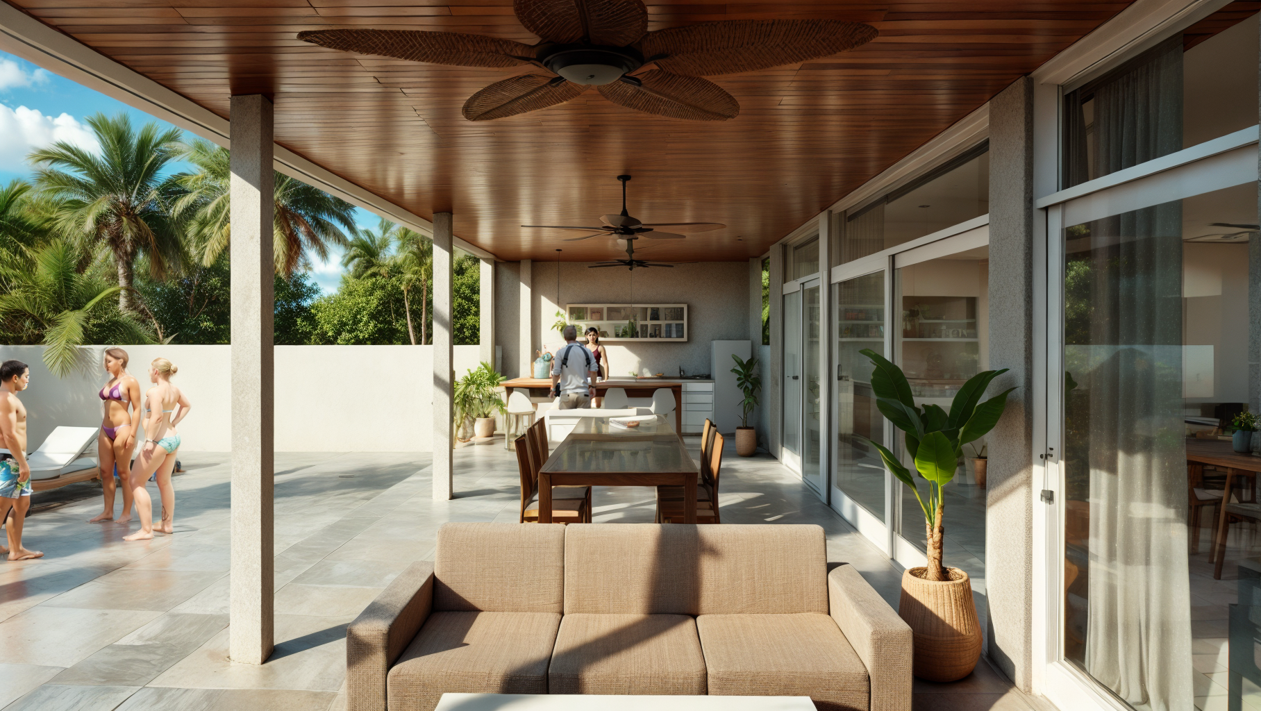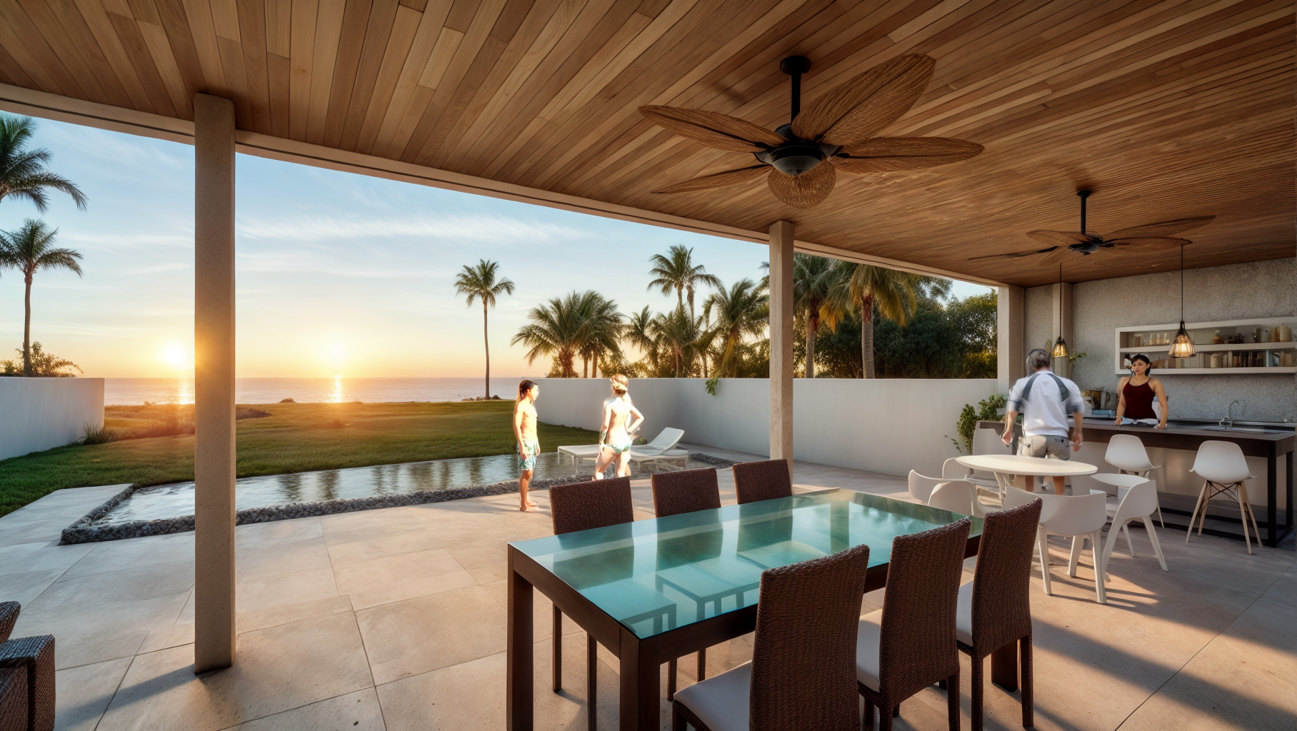 • Terraza techada tipo lounge, con ventiladores de cielo y mobiliario exterior.