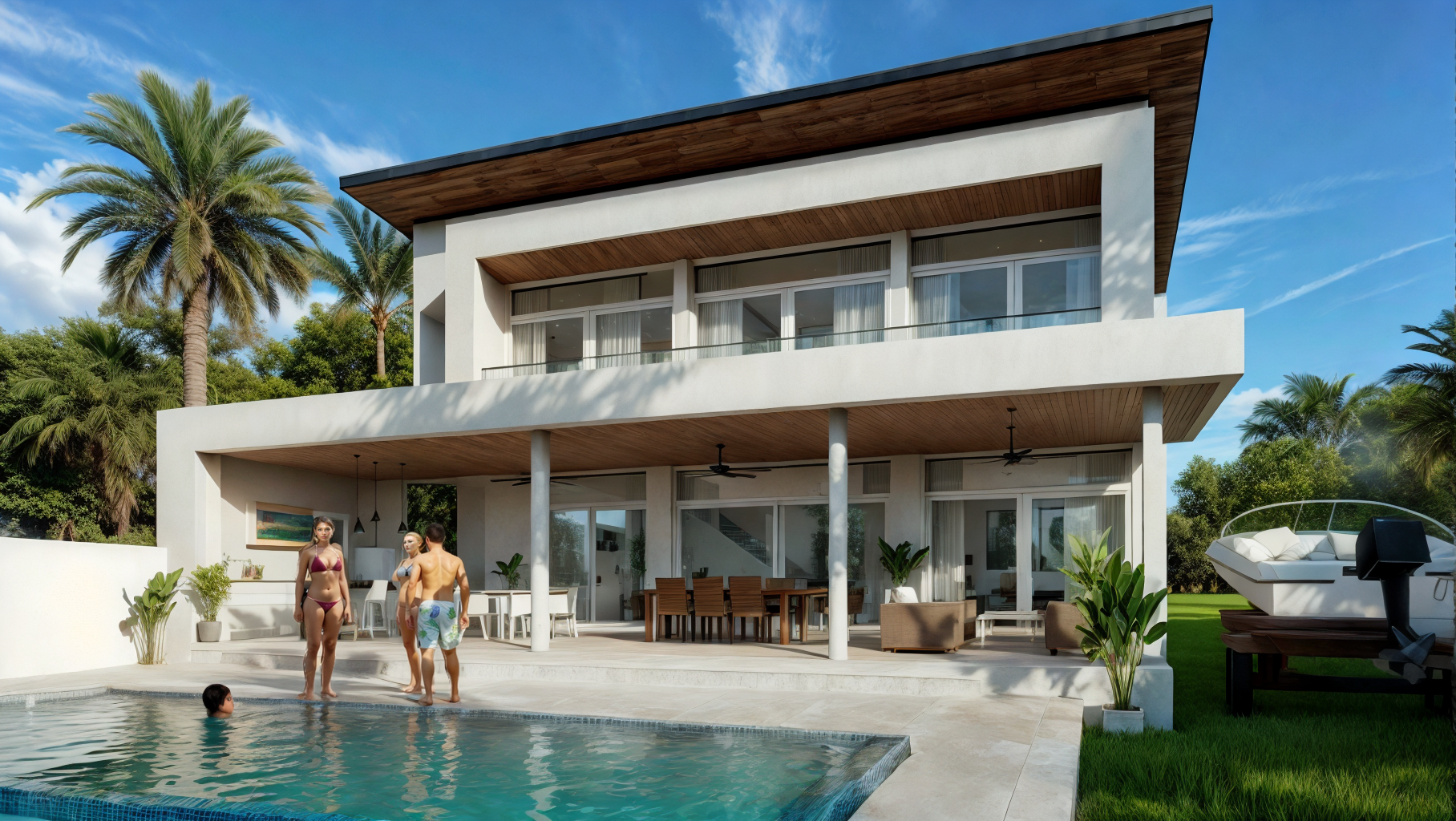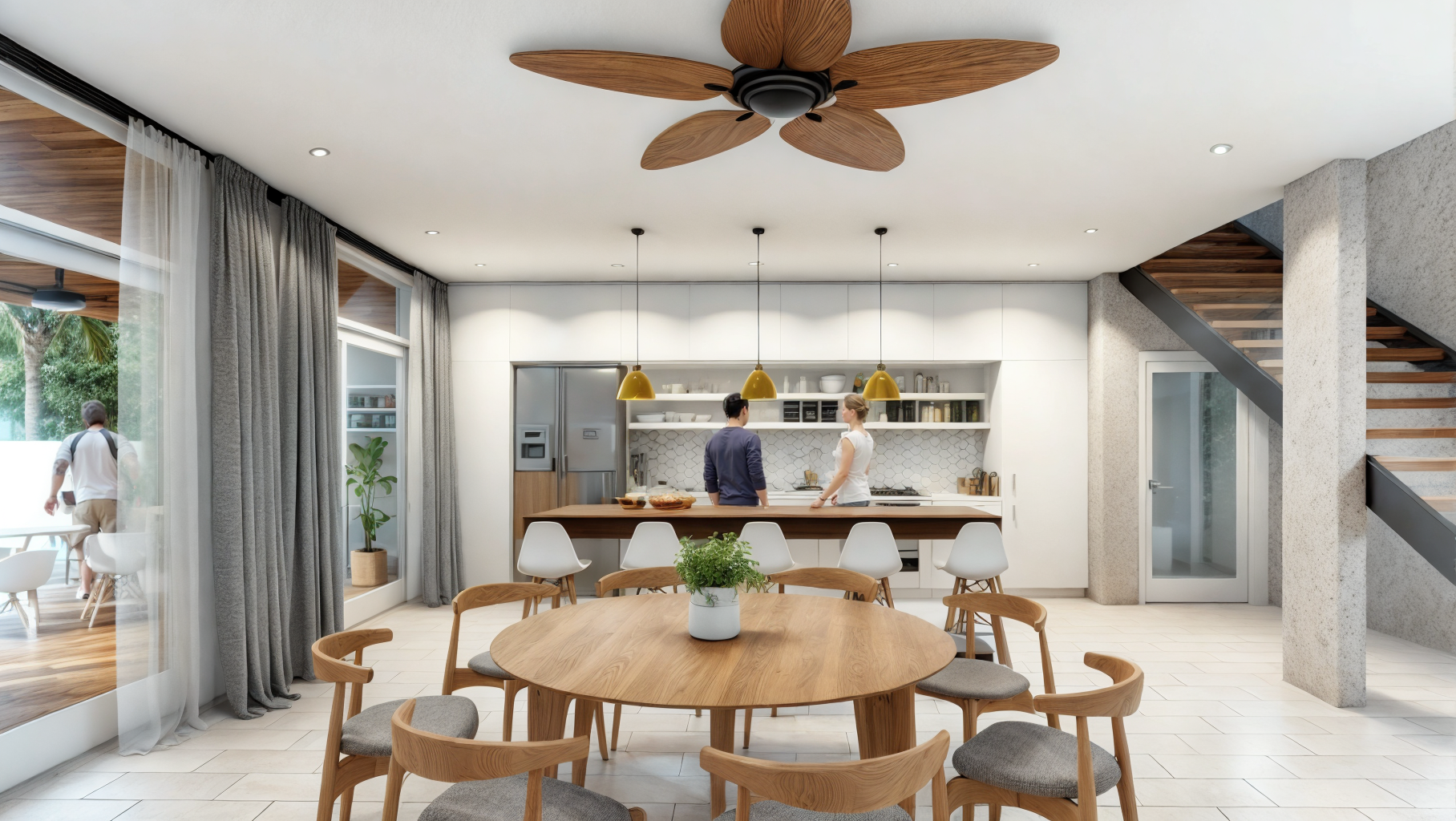 • Sala-comedor integrados con ventilación cruzada y apertura total hacia la terraza, generando una conexión fluida con la piscina.